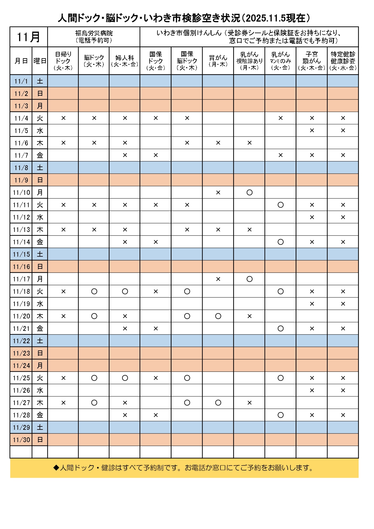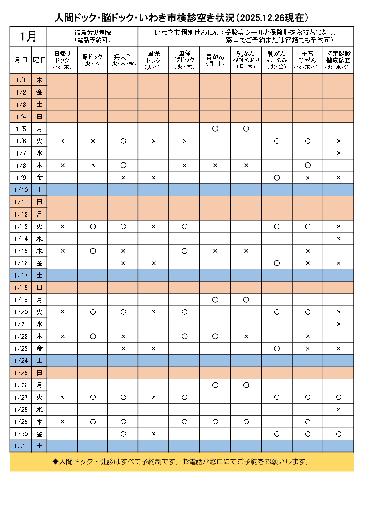 下記の表は、日帰り人間ドック・脳ドック・いわき市各種検診の空き状況を示したものです。 お申し込みは先着順となり、予約可能な空き枠数は常に変動いたしますので、ご了承下さい。