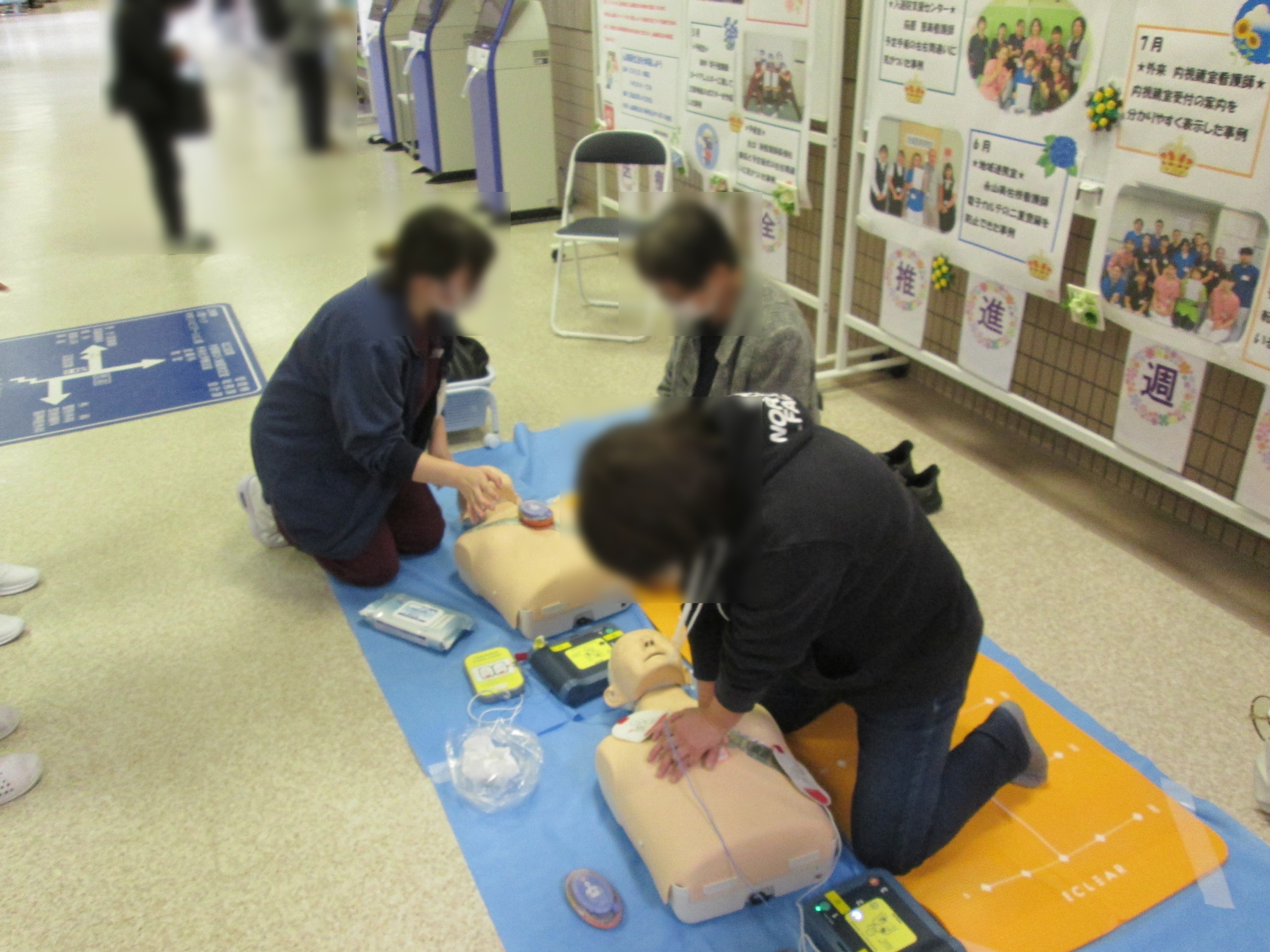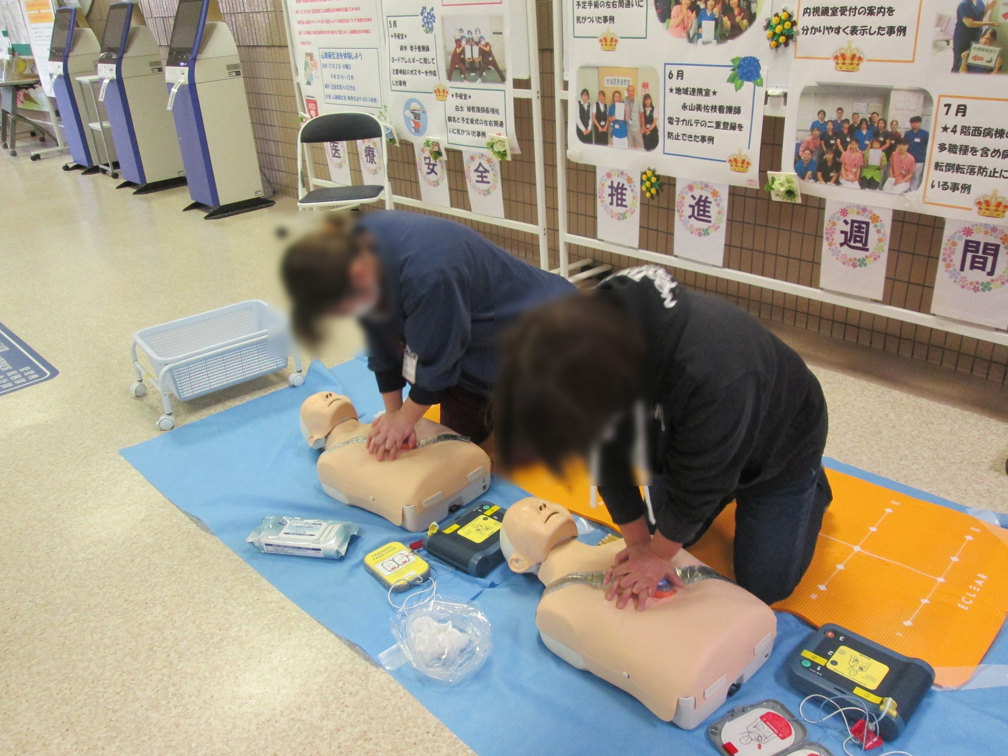 令和7年12月2日(火)に、いざというときの速やかな救命活動に繋がればという思いから、 来院された方々に心肺蘇生法を体験してもらいました。また、厚生労働省が定める「医療安全推進週間」に合わせて、 医療安全コーナーでは各部署の医療安全に向けた取組ポスターを掲示しました。